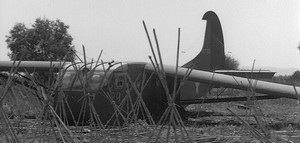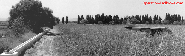 “This glider landed in a small tomato patch bordered by a 3 foot stone wall fence and 30 feet trees. It stalled onto the ground from considerable altitude, causing left struts to buckle and right aileron to break from its hinges. Eight troops went through their plywood seats. Indications are that it was an extremely safe landing and no one was hurt. Stopped 20 feet from where it first contacted ground, or approximately one-half fuselage length. Indications are that it encountered rifle fire while in flight.”